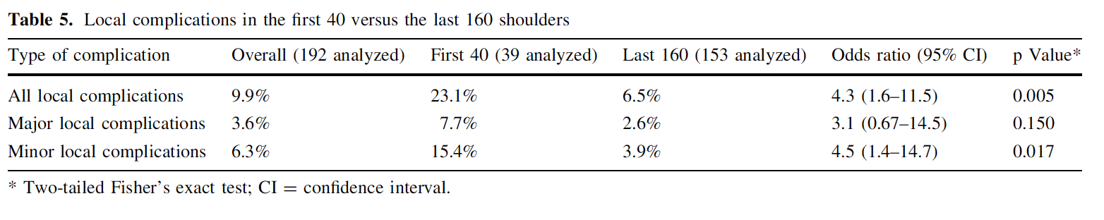 The local complication rate was higher in the first 40 shoulders (23.1%) versus the last 160 shoulders